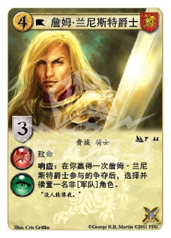 :在你赢得一次詹姆·兰尼斯特爵士参与的争夺后,选择并横置一名非[军队]角色。