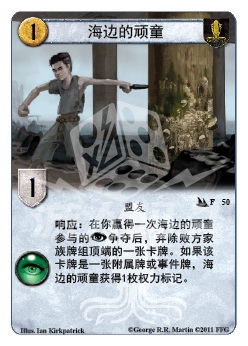 争夺后,弃除败方家族牌组顶端的一张卡牌。如果该卡牌是一张附属牌或事件牌,海边的顽童获得1枚权力标记。