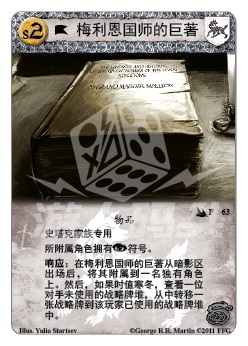 :在梅利恩国师的巨著从暗影区出场后,将其附属到一名独有角色上。然后,如果时值寒冬,查看一位对手未使用的战略牌堆,从中转移一张战略牌到该玩家已使用的战略牌堆中。