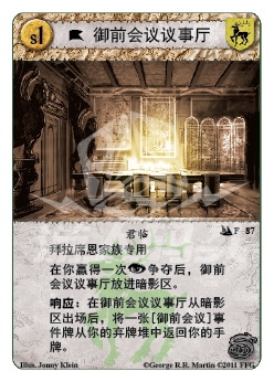 响应:在御前会议议事厅从暗影区出场后,将一张[御前会议]事件牌从你的弃牌堆中返回你的手牌。
