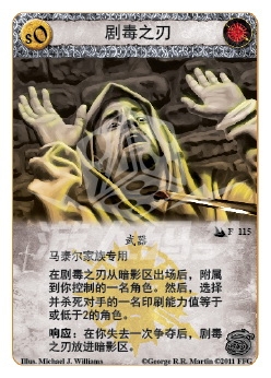 在剧毒之刃从暗影区出场后,附属到你控制的一名角色。然后,选择并杀死对手的一名印刷能力值等于或低于2的角色。