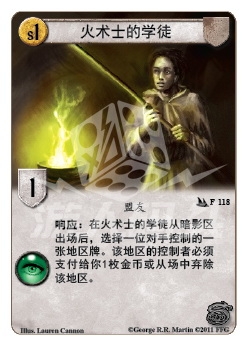 功能说明 响应:在火术士的学徒从暗影区出场后,选择一位对手控制的一张地区牌。该地区的控制者必须支付给你1枚金币或从场中弃除该地区。