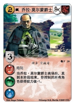 当乔拉·莫尔蒙爵士离场后,直到本阶段结束,你控制的所有角色获得能力值-1。