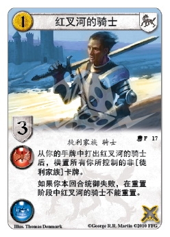 从你的手牌中打出红叉河的骑士后,横置所有你控制的非[徒利家族]卡牌。