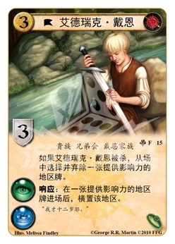 功能说明 如果艾德瑞克·戴恩被杀,从场中选择并弃除一张提供影响力的地区牌。