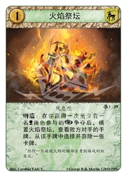 功能说明 响应:在你赢得一次至少有一名崇圣角色参与的阴谋争夺争夺后,横置火焰祭坛,查看败方对手的手牌。从该手牌中选择并弃除一张卡牌。