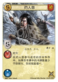 在灼人部参与进攻的任何争夺中,如果你手牌中的卡牌数量少于防御方,你的效能值+1。