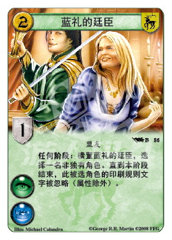 :横置蓝礼的廷臣,选择一名非独有角色。直到本阶段结束,此被选角色的印刷规则文字被忽略(属性除外)。