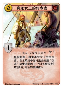 :横置真龙女王的传令官,在本阶段中你打出或使用“伏击”放置进场的下一张[多斯拉克]或[真龙]角色的费用减1。