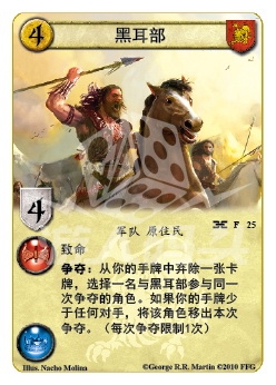争夺:从你的手牌中弃除一张卡牌,选择一名与黑耳部参与同一次争夺的角色。如果你的手牌少于任何对手,将该角色移出本次争夺。(每次争夺限制1次)