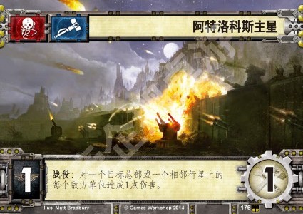 文本战役:对一个目标总部或一个相邻行星上的每个敌方单位造成1点伤害。