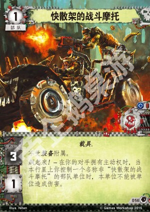 – 在你的对手拥有主动权时,当本行星上你控制一个名称非“快散架的战斗摩托”的部队单位时,本单位不能被单位造成伤害。