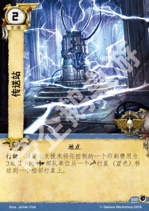 文本行动:横置本支援来将你控制的一个印刷费用为3或以下的星际战士部队单位从一个科技行星(蓝色)移动到一个相邻行星上。