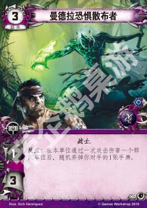 文本反应:在本单位通过一次攻击伤害一个部队单位后,随机弃掉你对手的1张手牌。