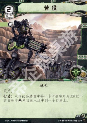 :从你的弃牌堆中将一个印刷费用为3或以下的目标非太空死灵单位放入场中到一个行星上。