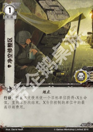 :横置本支援来使一个目标单位获得+X生命值,直到本阶段结束。X为你控制的单位中的最高印刷费用。