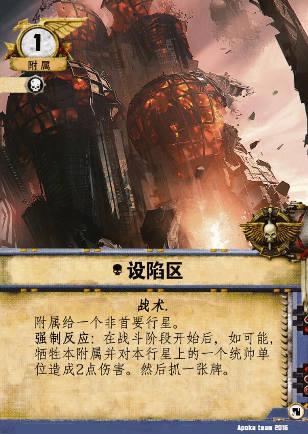 :在战斗阶段开始后,如可能,牺牲本附属并对本行星上的一个统帅单位造成2点伤害。然后,抓一张牌。
