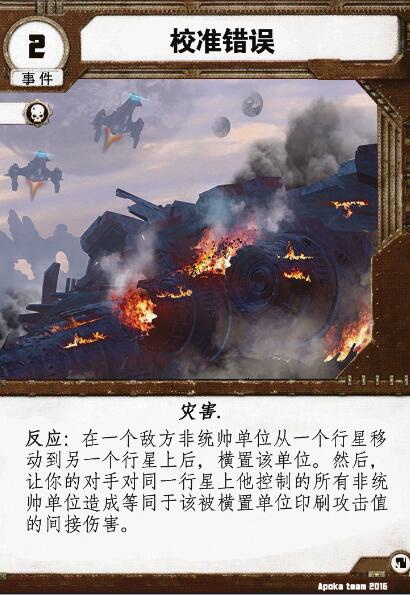 反应:在一个敌方非统帅单位从一个行星移动到另一个行星上后,横置该单位。然后,让你的对手对同一行星上他控制的非统帅单位造成等同于被横置单位印刷攻击值的间接伤害。