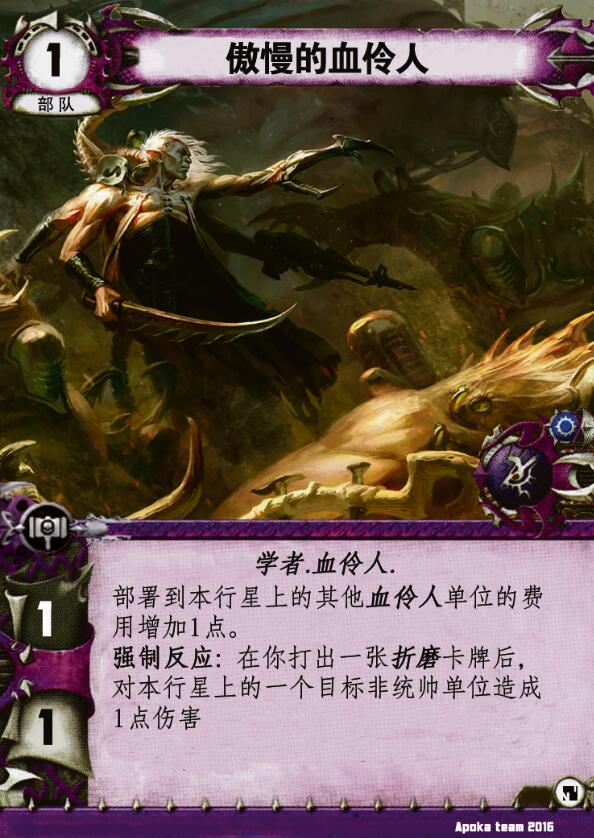 强制反应:在你打出一张折磨卡牌后,对本行星上的一个目标非统帅单位造成1点伤害。