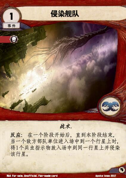 反应:在一个阶段开始后,直到本阶段结束,当一个敌方部队单位进入场中到一个行星上时,将1个兵虫指示物放入场中到同一行星上并侵染该行星。