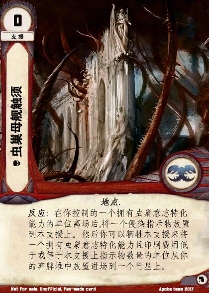 反应:在你控制的一个拥有虫巢意志特化能力 的单位离场后,将一个侵染指示物放置到本支援上。然后你可以牺牲本支援来将一个拥有虫巢意志特化能力且印刷费用不高于本支援上指示物数量的单位从你的弃牌堆中放置进场到一个行星上。