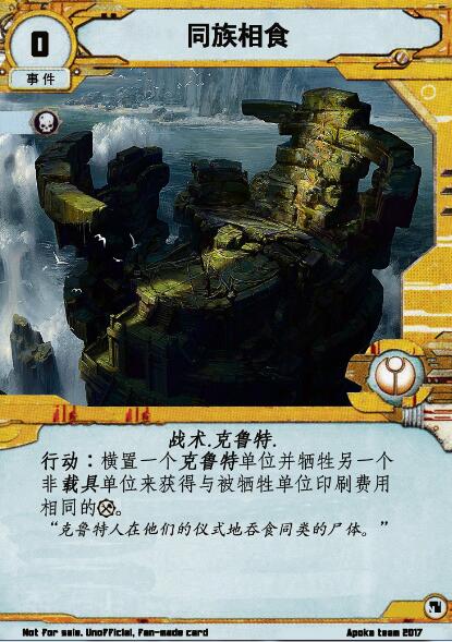 行动:横置一个克鲁特单位并牺牲另一个非载具单位来获得与被牺牲单位印刷费用相同的资源。