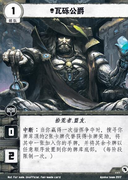 中断:当你赢得一次指挥争夺时,搜寻你牌库顶的2张卡牌代替获得卡牌奖励,将其中一张加入你的手牌,并将其余卡牌以任意顺序放置到你的牌库